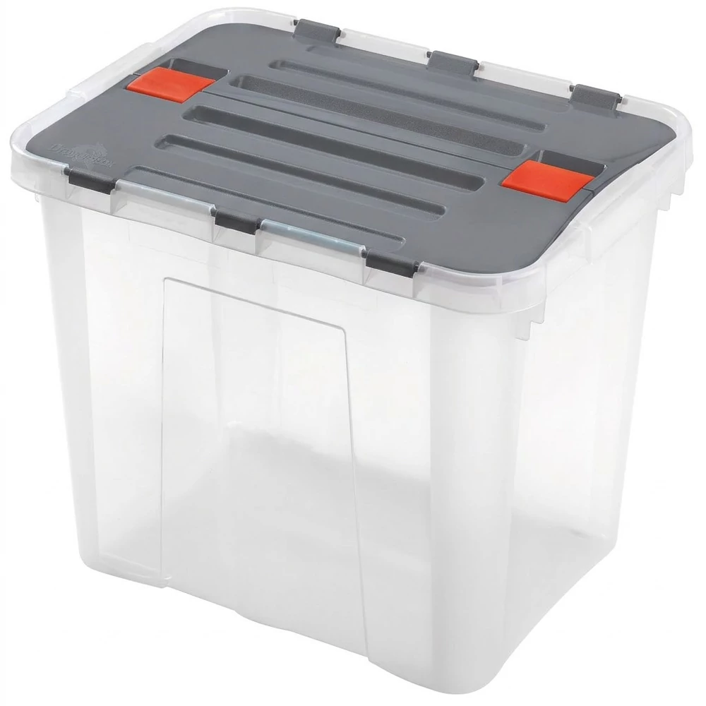 A szürke színű fedél nemcsak esztétikus, de a mechanikus clipzárak révén stabilan és pormentesen záródik. A víztiszta, transzparens doboztestnek köszönhetően a 30 literes belső tartalom felnyitás nélkül is azonnal beazonosítható. Legyen szó szezonális ruhákról, nagyobb takarókról vagy játékokról, ez a tároló garantálja a higiénikus és rendezett megőrzést.