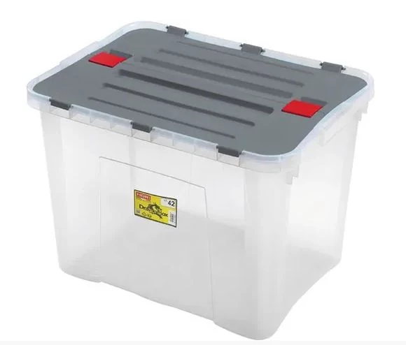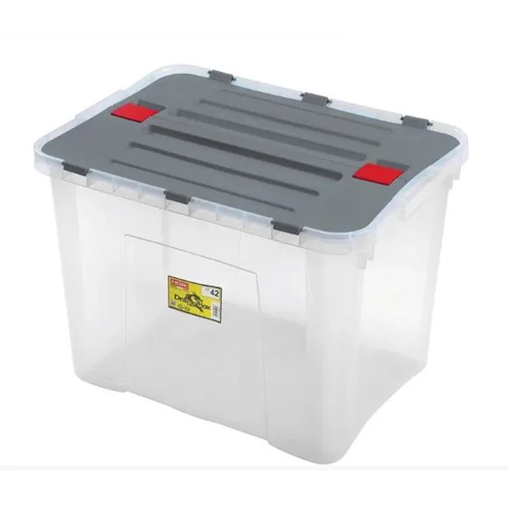 Prémium rendszerezés nagy kapacitással: 42 literes űrtartalom, innovatív oldalra nyíló szürke fedél és biztonságos clipzár a hatékony, pormentes otthoni tároláshoz.