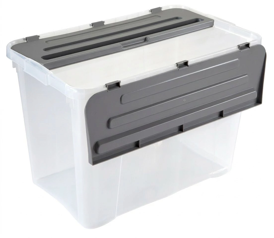 Okos megoldás nagy térfogathoz: 60 literes, masszív tárolódoboz oldalra nyíló zsanéros fedéllel és biztonsági clipzárral, amely fix rögzítésével megkönnyíti a mindennapi rendszerezést.