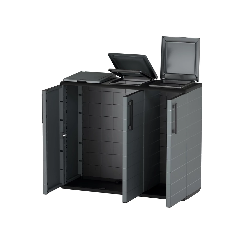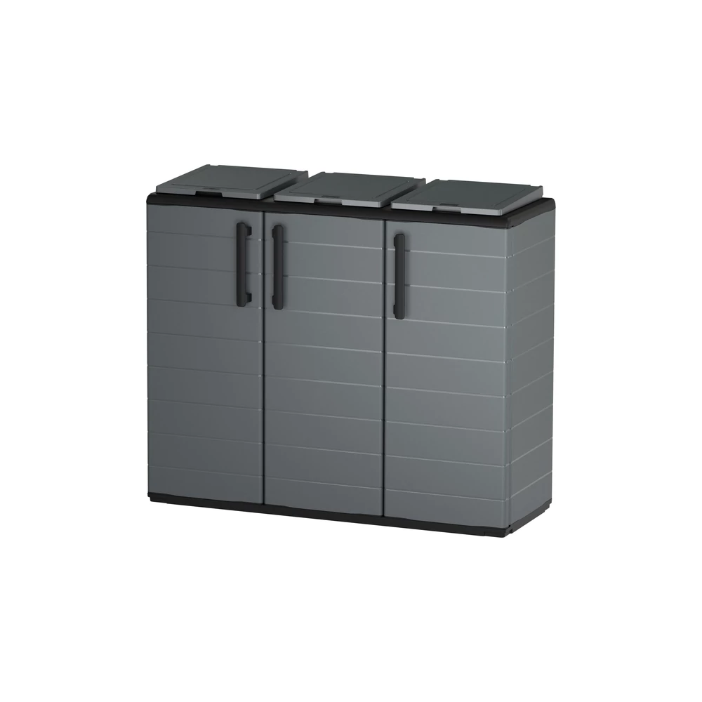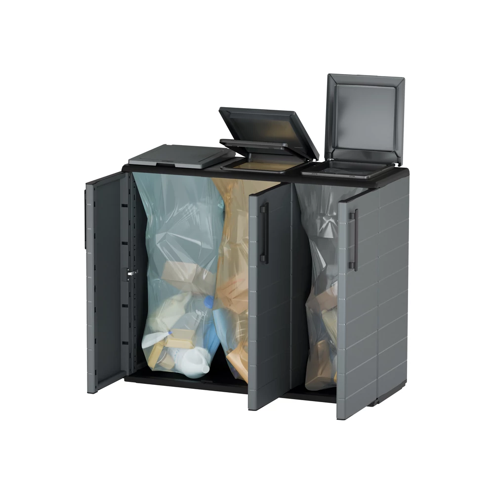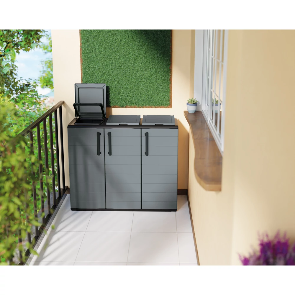 Az Art Plast extra széles szelektáló szekrénye a Plasticbox.hu kínálatában a legmagasabb szintre emeli a hulladékkezelést. A több mint egy méter széles kialakítás és a három különálló nyílás lehetővé teszi a papír, műanyag és üveg (vagy kommunális hulladék) egyidejű, esztétikus és teljesen szagmentes tárolását.