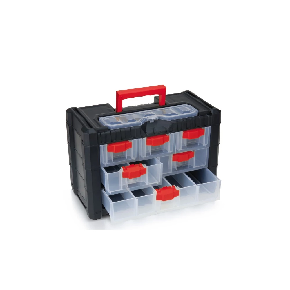 - Mobilis és stabil: A süllyeszthető fogantyúval könnyen hordozható, míg a kicsúszásgátló mechanizmus megelőzi a fiókok véletlen nyitódását cipelés közben.