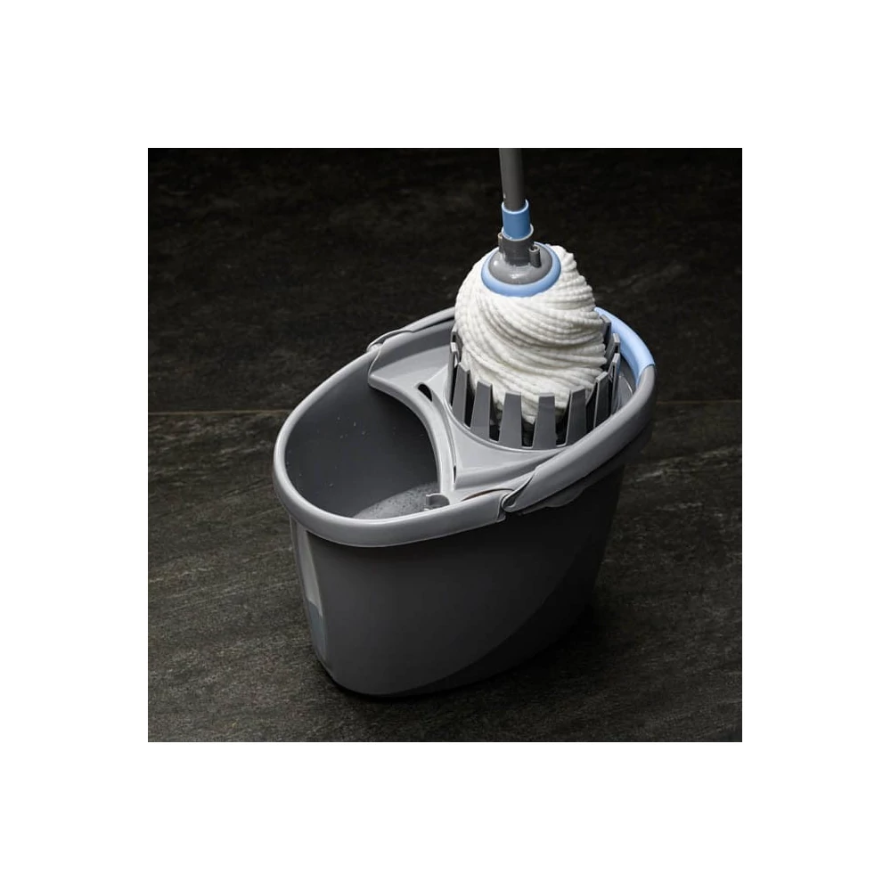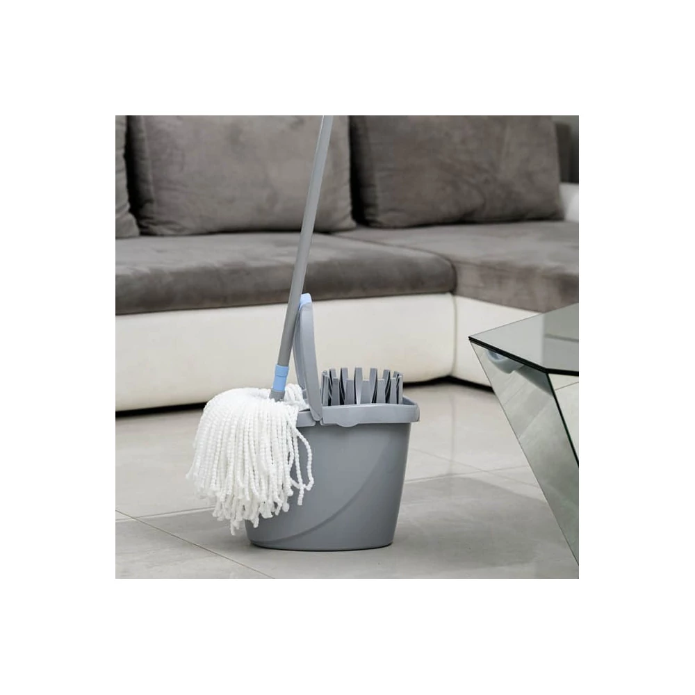 Nagyméretű és stabil vödör 12 literes kinyomóval. A takarító kényelme érdekében "ablakkal" és mérővel van felszerelve, amely lehetővé teszi a vödör tartalmának ellenőrzését. A felül lekerekített forma és az alsó fogantyú lehetővé teszi a víz kényelmes öntését a véletlen kiömlés veszélye nélkül. A masszív fogantyú csúszásgátló bevonattal borított, így még nedves kézzel is könnyen szállítható. A készlet tartalmaz egy felmosó csavarót fogantyúval a fogantyú rögzítéséhez. Nincs tartósan rögzítve, így szükség esetén eltávolíthatja, és magát a vödröt használhatja.
